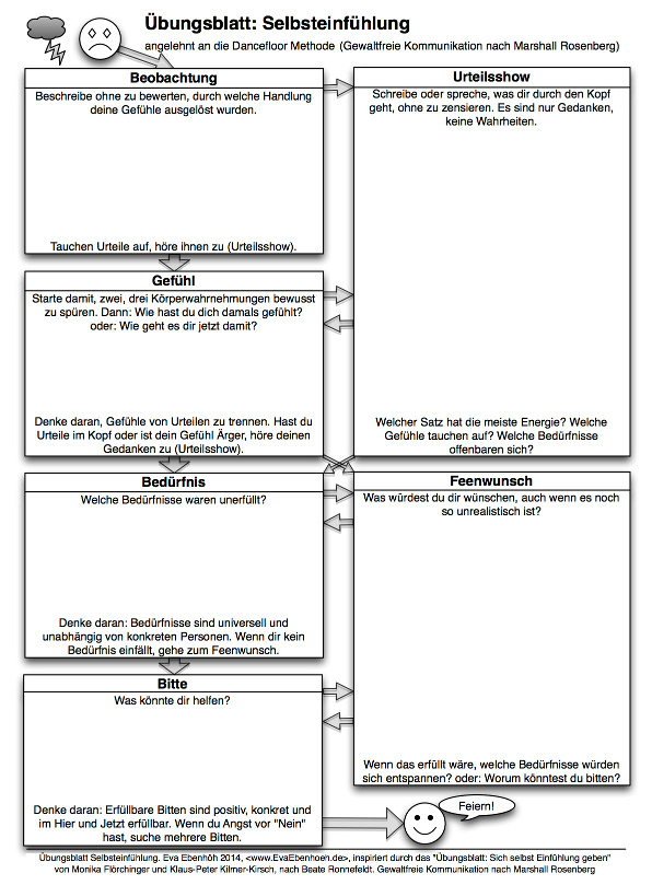 Nachdem nun die vier Schritte: Beobachtung, Gefühl, Bedürfnis und Bitte, näher erklärt wurden, ist es Zeit für einen zweiten Selbstempathieprozess - diesmal mit Arbeitsblatt.